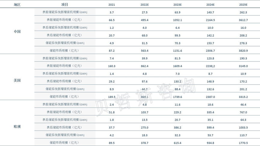 伴随全球新型电力系统的建设,表前储能建设将进入建设高潮。同时海外能源危机的催化使家庭户储成为刚需,预计到2025年全球储能市场装机规模将达661.3GWh,新增装机市场规模将达10062.3亿元,中美欧将是全球储能装机主力。其中中国和美国装机将以表前储能为主,欧洲则以户用储能为主。户储方面,在欧洲高电价下是刚需,预计2021-2025年表后储能装机复合增速将达142.8%;大储方面中美两国是装机主力,预计到2025年中国表前储能新增装机将达262.3GWh。