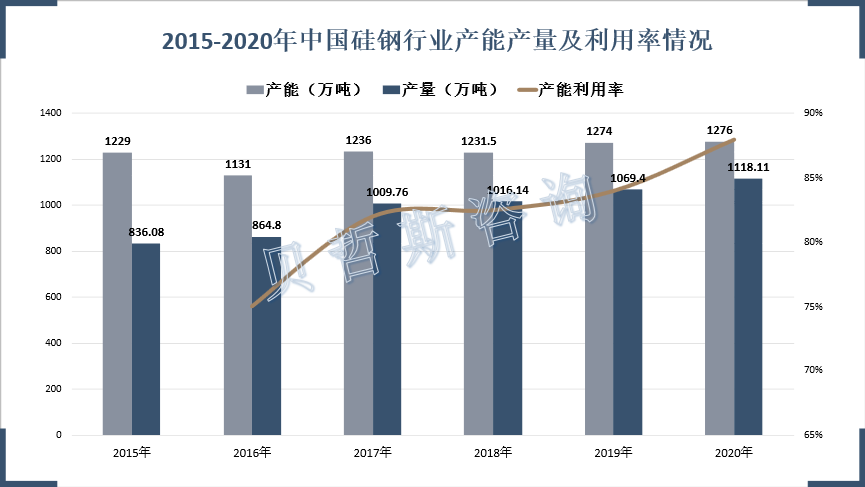供给侧结构性改革政策的推动下,中国钢铁产能取得显著成效,行业内企业布局优化,加大了对取向电工钢产品的供应,行业产能利用率稳步提升。据统计,2020年中国硅钢行业产能为1276万吨,产量为1118.11万吨,产能利用率为87.60%。