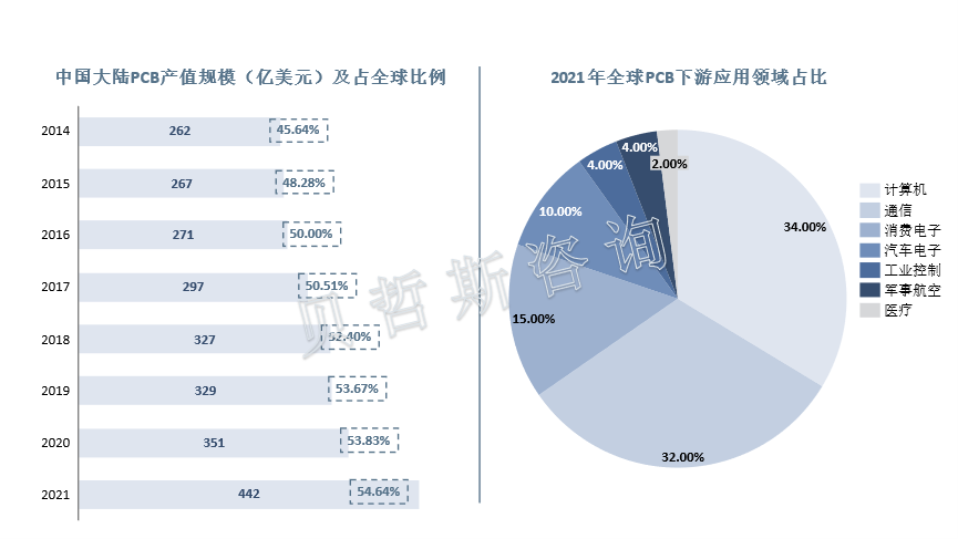 PCB产业的发展水平在一定程度上,反映了一个国家或地区电子产业的发展速度与技术水准。近年来,全球PCB产值整体呈增长趋势,据统计,2021年全球PCB行业产值达到809亿美元,同比增长24.08%。PCB下游应用十分广泛,2021年全球PCB行业下游第一大应用为通讯领域,占比达32%;其次是计算机行业,占比24%;再是消费电子领域,占比15%。我国大陆PCB行业产值从2014年的262亿美元提升至2021年的442亿美元。2016年以来,我国大陆PCB产值规模在全球的比重保持在50%以上。随着PCB产业转移的深化,我国PCB产值规模比重将进一步提升。