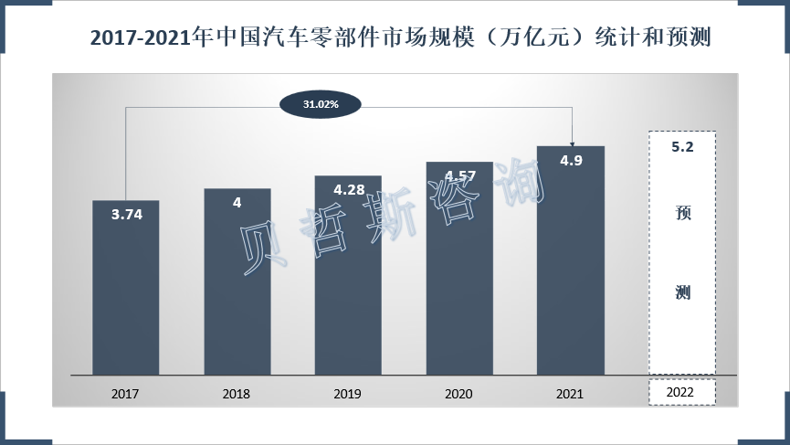 汽车零部件作为汽车工业的基础,是支撑汽车工业持续健康发展的必要因素。特别是当前汽车行业正积极自主开发与创新,汽车零部件对其起到的重要作用日益凸显。随着中国汽车行业的高速发展、汽车保有量的增加以及汽车零部件市场的扩大,中国汽车零部件行业得到了迅速发展,增长速度整体高于中国整车行业。数据显示,中国汽车零部件的销售收入从2017年3.74万亿元增长至2020年的4.57万亿元,年均复合增长率6.9%。预计2022年中国汽车零部件销售收入将达5.2万亿元。