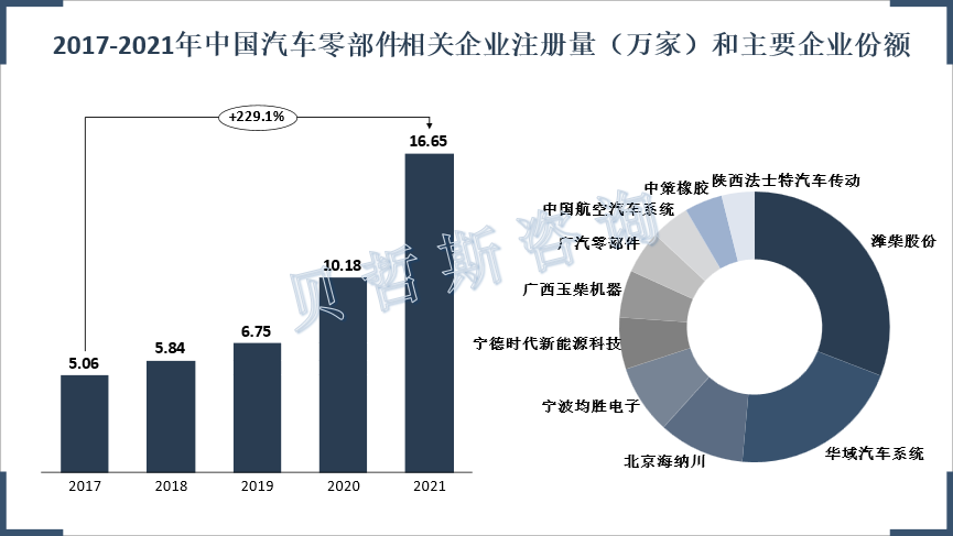 近年来,中国汽车零部件相关企业注册量持续增长,2020-2021年汽车零部件相关企业注册量超10万家。2021年汽车零部件相关企业注册量16.65万家,同比增长63.6%。最新数据显示,2022年1-5月,中国汽车零部件相关企业注册量7.24万家。