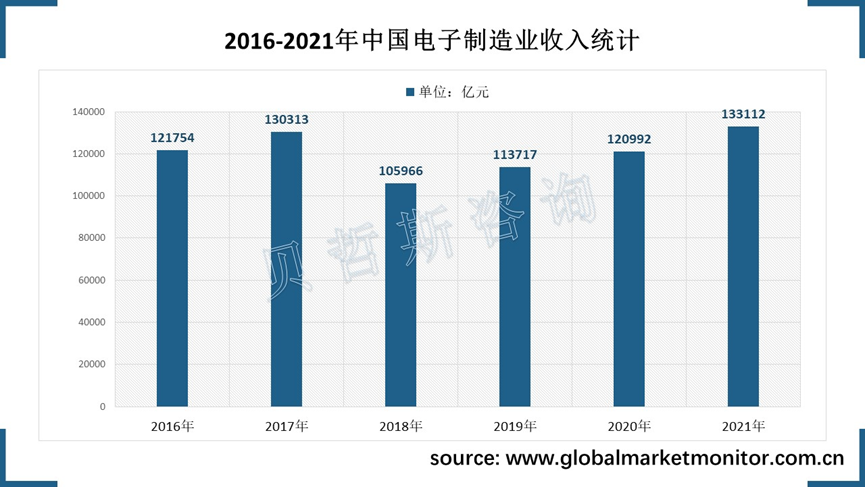 作为中国的支柱产业之一,电子行业是国家战略性发展产业,在国民经济生产中占有重要地位。数据显示,2020年1-12月,中国规模以上电子信息制造业实现主营业务收入120992.1亿元,同比增长8.3%;从行业运行趋势来看,一季度、上半年、前三季度及全年,电子制造业增加值累计增速分别为-2.8%、5.7%和7.2%和7.7%。2021年中国电子制造业市场规模达到13112亿元。