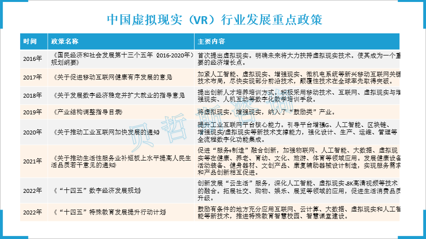 虚拟现实技术(VR)是20世纪发展起来的一项全新的实用技术,在游戏、视频、直播、教育、医疗等多个领域均有应用。近年来,中国政府和各部门出台了不少政策,在技术研发、人才培养、产品消费等方面,支持虚拟现实行业的发展。