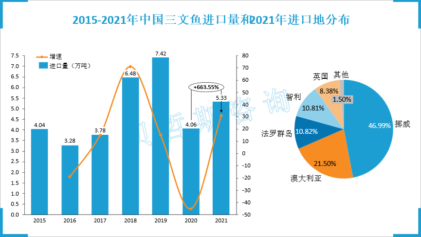 从中国三文鱼进出口来源地来看,中国主要出口品种熏三文鱼以及制作或保藏的鲑鱼几乎全部出口到日本,而进口的鲜冷三文鱼主要来自挪威、澳大利亚、法罗群岛,其中挪威是最大的三文鱼进口地区,2021年从挪威进口三文鱼2.51万吨,较2020年同比增长45.06%,占比达进口总量的46.99%。