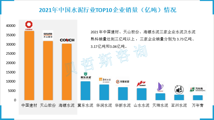 因水泥运输半径短,区域竞争格局呈现差异,但中国建材、海螺水泥基本稳居前列。华东地区熟料产能前三企业分别为中国建材、海螺水泥、山水集团,中南地区前三企业为中国建材、海螺水泥、华润水泥,西南地区前三企业为中国建材、海螺水泥、华新水泥,华北地区前三企业为金隅冀东、中国建材、山水水泥,西北地区前三企业为中国建材、尧柏水泥、海螺水泥,东北地区前三企业为中国建材、亚泰集团、山水水泥。整体看,中国建材除华北市场外均稳居各区域熟料产能首位,海螺水泥在华东、中南、西南、西北地区稳居产能前三位置。据中国水泥协会公布的2022年中国水泥上市公司综合实力排名公告,2021年中国建材、天山股份、海螺水泥三家企业水泥及水泥熟料销量达到三亿吨以上,三家企业销量分别为3.73亿吨、3.17亿吨和3.04亿吨。