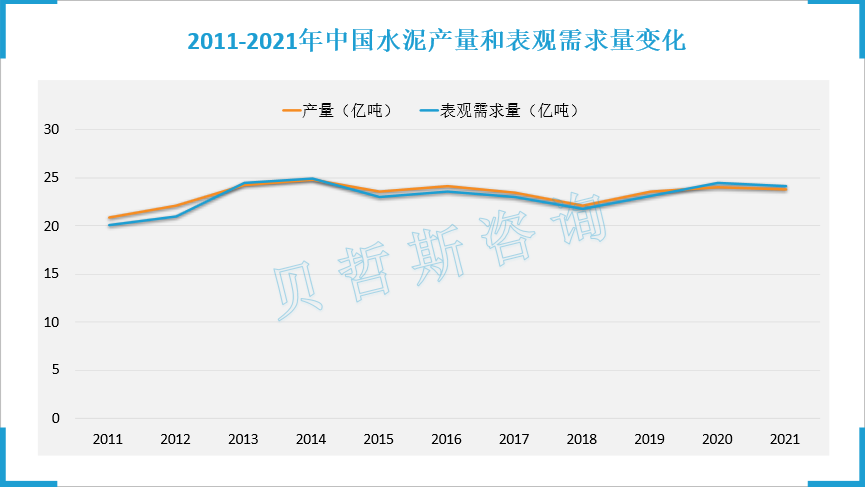 2010-2021年,中国水泥产量呈波动增长态势。2021年,中国水泥产量为23.78亿吨,同比下降0.7%。在水泥需求方面,根据国家统计局数据显示,2010-2021年,中国水泥表观需求量总体呈波动趋势。2020年,为满足防疫需要,中国基础设施项目加强,同时房地产投资维持一定水平,对水泥需求提供了较强支撑,全年水泥表观需求量24.29亿吨,同比增长4.3%。2021年,中国水泥表观需求量23.92亿吨,同比下跌1.5%。