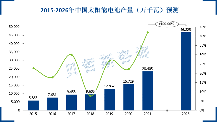 目前,中国化石能源仍占能源消费的主要部分。“十四五”规划高度重视清洁能源的发展,尤其是“双碳”目标提出后,光伏行业重要性凸显。加上光伏企业对光伏电池降本增效需求增加,以及高效太阳能电池技术的冲击,太阳能电池迎来了一波需求热潮,带动行业产量增长。到2026年,中国太阳能电池产量将达到46825万千瓦。