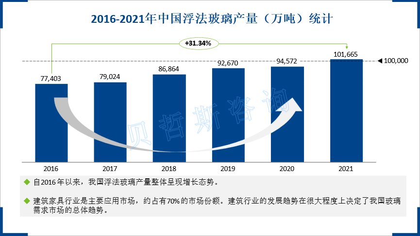 2016年以来,中国浮法玻璃产量总体呈增长趋势。数据显示,2021年,中国已生产浮法玻璃101664.7万吨,同比增长8.4%。