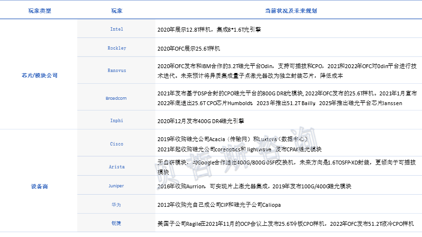 随着人工智能、大数据、云计算应用需求的发展,驱动数据中心规模不断扩大,对带宽容量与高速数据传输速率的需求明显增加。未来CPO将成为云提供商数据中心的主导使能技术,最初将应用于超大规模数据中心,随后低时延与高速率应用将推动CPO需求,人工智能、机器学习等领域有望成为主要驱动因素。目前AWS、微软、Meta、谷歌等云计算巨头,思科、博通、MarvellI、IBM、英特尔、英伟达、AMD、台积电、格芯、Ranovus等网络设备龙头及芯片龙头,均前瞻性地布局CPO相关技术及产品,并推进CPO标准化工作。ChatGPT加速的Al的进程,对于功耗和成本的要求来得更快。CPO配套硅光可能在未来2-3年有望快速放量。因为属于新兴产品,相关供应商仍少,国内代表性公司天孚通信,以及其他陆续有布局的中际旭创、新易盛、光创联等,其中亨通光电联合英国Rockley推出了3.2T的CPO交换机样机。
