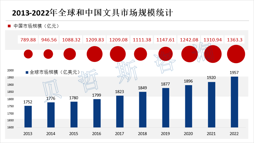 文具通常是指用于办公、学习等用途的各种工具。近年来全球文具市场规模保持稳定,2021年全球文具市场规模达1920亿美元,较2020年增加了24.0亿美元,同比增长1.3%。