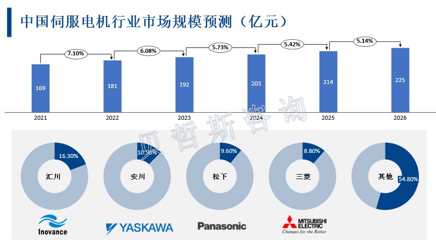 伺服是自动化运动控制核心部件,以位置、速度、转矩为控制量,动态跟踪目标变化从而实现控制。伺服系统主要由伺服电机、伺服驱动器构。从伺服电机市场竞争格局来看,国际企业主要有日本的松下、安川、三菱、三洋,以色列的ELMO,美国AMC、COPLEY等。汇川技术是国内伺服电机的领军企业。2021年汇川技术通用伺服系统在中国市场份额达到16.3%,首次超越外资品牌,获得市场份额第一名,我国国产品牌厂商整体市场份额超越日韩系厂商,占国内整体伺服系统市场42%,成为中国市场的第一大贡献体。