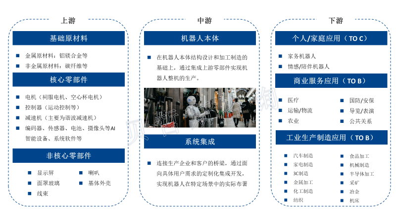人形机器人产业链可分为三大部分:上游零部件&原材、中游系统集成&本体制造、下游个人以及企业相关应用场景。根据Ofweek数据,工业机器人成本构成中,核心零部件减速器/伺服电机/控制器成本分别占比35%、15%、15%。核心零部件占比工业机器人成本约70%,人形机器人相较于传统工业机器人,自由度大幅提升,预计将使用比工业机器人更多的减速器与电机,核心零部件(减速器、伺服电机等)需求有望大幅提升。