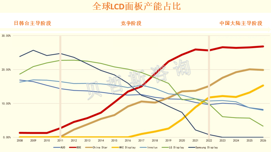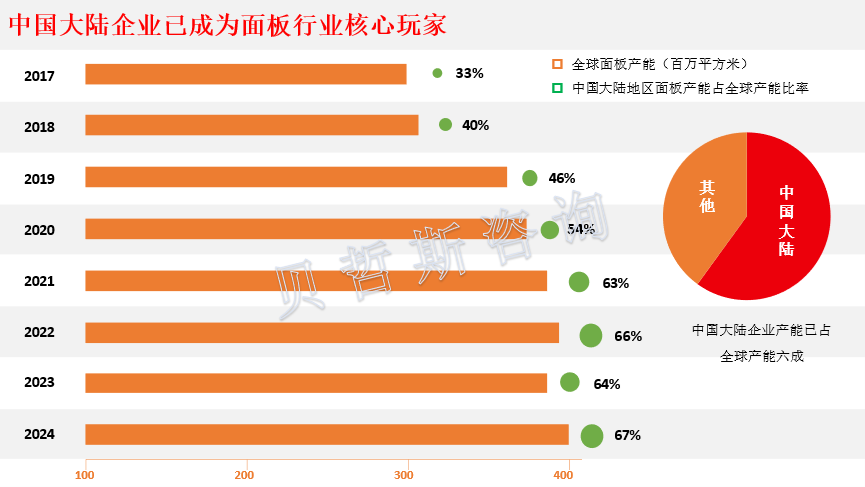 中国电子信息产业发展研究院发布的《中国新型显示产业发展现状与趋势洞察》报告显示,中国大陆显示产业在过去十多年内,规模持续增长,2012年——2021年,年均复合增长率高达25.8%,2022年中国大陆企业显示面板年产能达到2亿平方米,占全球的60%左,中国大陆企业已成为面板行业核心玩家。中国大陆企业保持产能利用率高位,利用扩产满产双策略加快市场竞争节奏,中国大陆面板产线保持产能利用率在 90%左右,产 能逐年爬坡,通过扩产满产双策略,加速行业竞争,不断提升自身市场份额。2021年,中国大陆面板厂商销售收入份额为41.5%,超过韩国厂商33.2%,终结了韩国在全球新型显示领域长达17年的霸主地位。