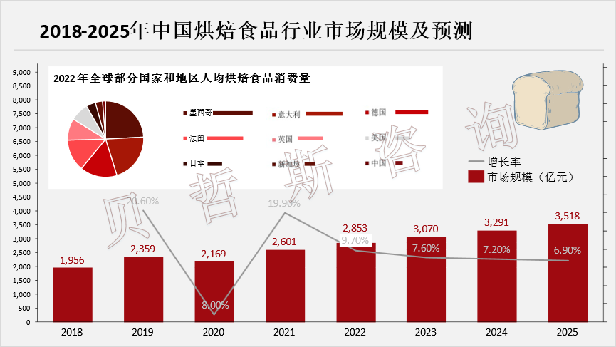 近年来,在中国休闲食品行业受到各级政府的高度重视和国家产业政策的重点支持。国家陆续出台了多项政策为休闲食品行业的发展提供了明确、广阔的市场前景,为企业提供了良好的生产经营环境。中国的烘焙行业起步晚,但规模在不断扩大,市场处于快速成长的黄金期。2022年中国烘焙食品行业市场规模达2853亿元,同比增长9.7%。随着人均消费水平的增长及餐饮消费结构调整,中国烘焙食品市场将持续扩容,2025年市场规模预计达到3518亿元。