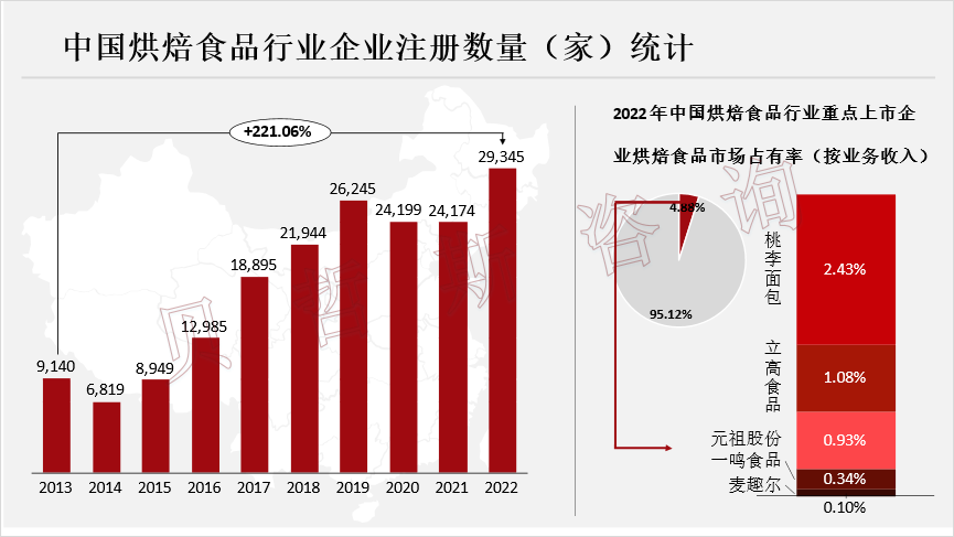 2022年中国烘焙食品行业相关企业注册数量为29345家,2020-2022年烘焙食品行业企业数量增长较为强劲,2022年创下历史新高。
