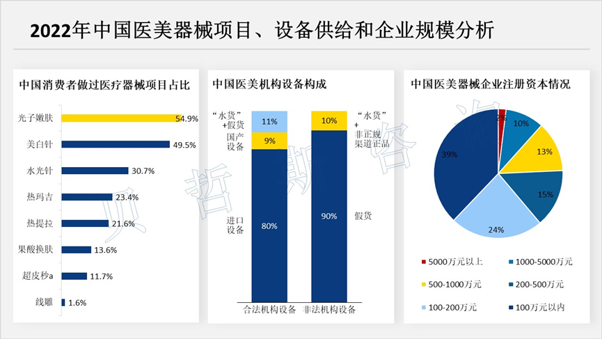中国医美器械产业总体起步落后于欧美发达国家,目前中国正规医美机构设备的市场份额80%由进口商占据,高端市场被飞顿、塞诺龙等海外龙头企业凭借强大的研发能力、品牌力和影响力所抢占,国产品牌大多占据的是中低端市场。同时,在合法或非法机构中假货和“水货”问题都同样存在。
