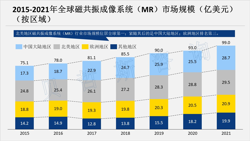 与此同时,近年来,随着全球主要国家不断加大MR领域的技术与研发投入,系统的新性能不断提高,应用领域不断拓展,市场规模持续扩大。数据显示,截止到2020年底,北美地区磁共振成像系统(MR)行业市场规模为28.8亿美元,位居全球第一;紧随其后的是中国大陆地区,磁共振成像系统(MR)市场规模达到25.5亿美元,市场增速较快;欧洲地区排名第三,市场规模为20.5亿美元。