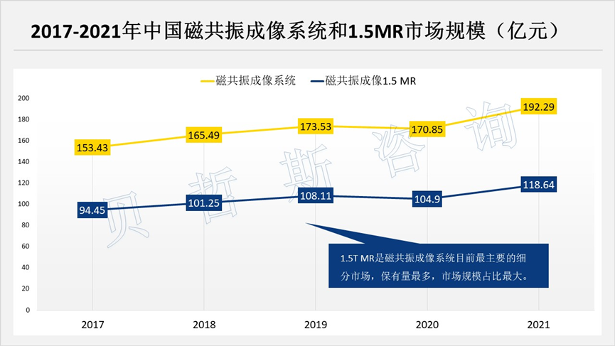 根据中国医学装备协会统计,中国市场2017至2021年磁共振成像系统市场保持高速增长,年复合增长率达到5.93%。2021年中国磁共振成像系统行业市场规模为192.29亿元。