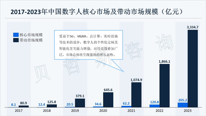 根据数据显示,2021年中国数字人核心市场规模和带动市场规模分别为62.2亿元和1074.9亿元,预计2023年市场规模将分别达到205.2亿元和3334.7亿元,市场总体将呈现强劲的增长态势。