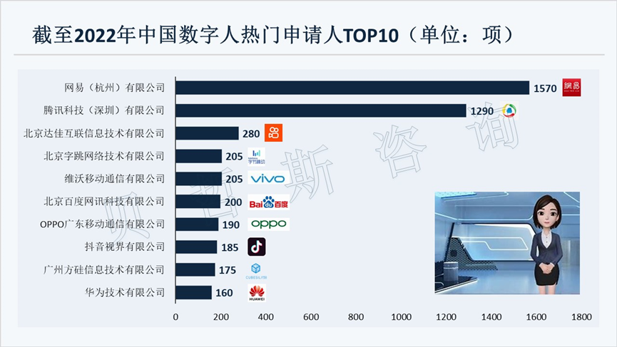 中国数字人领域专利申请数量TOP10申请人分别是网易(杭州)网络有限公司、腾讯科技(深圳)有限公司、北京达佳互联信息技术有限公司、北京字跳网络技术有限公司、维沃移动通信有限公司、北京百度网讯科技有限公司、OPPO广东移动通信有限公司、抖音视界有限公司、广州方硅信息技术有限公司、华为技术有限公司。其中,网易(杭州)网络有限公司在数字人领域专利申请数量最多,公司专利数量达1535项,腾讯科技(深圳)有限公司排名第二,其数字人领域专利申请数量达1295项。