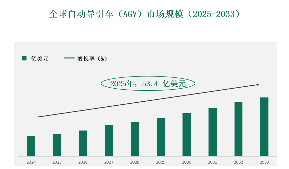 2025年全球自动导引车(AGV)市场规模估计为53.4亿美元,预计到2033年将达到91.8亿美元。