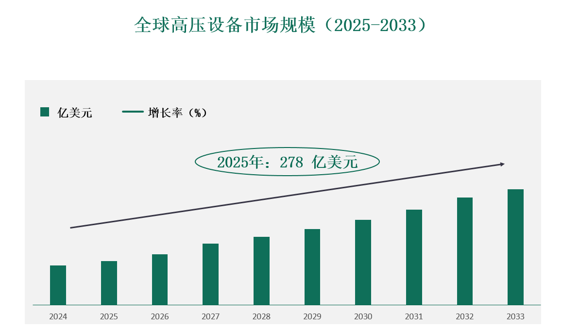 全球高压设备市场预计将从2025年的278亿美元增长到2033年的 402.9 亿美元,呈现稳定的增长轨迹。