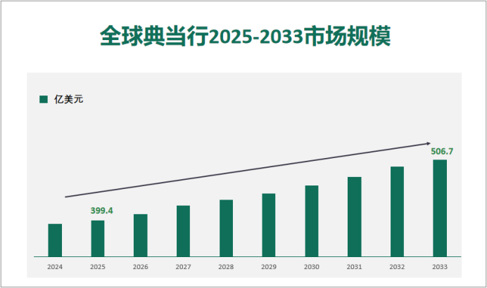 2025年全球典当行2025年市场价值为399.4亿美元,预计到 2033 年将达到506.7亿美元。