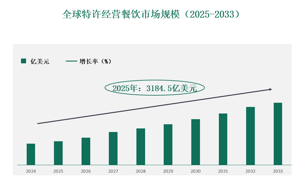 2025年,特许经营餐饮市场价值为3184.5亿美元,预计到2033年,全球特许经营餐饮市场总价值将达到5083.3亿美元。