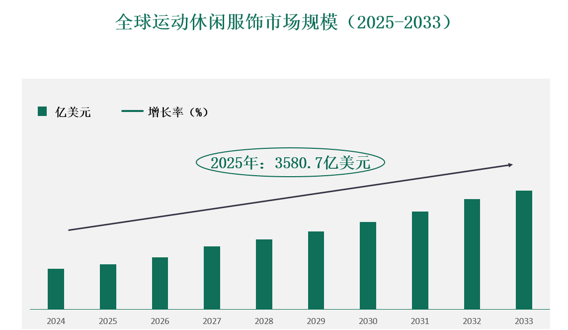 2025年全球运动休闲服饰市场规模估计为3580.7亿美元,预计到2033年将达到6625.6亿美元。