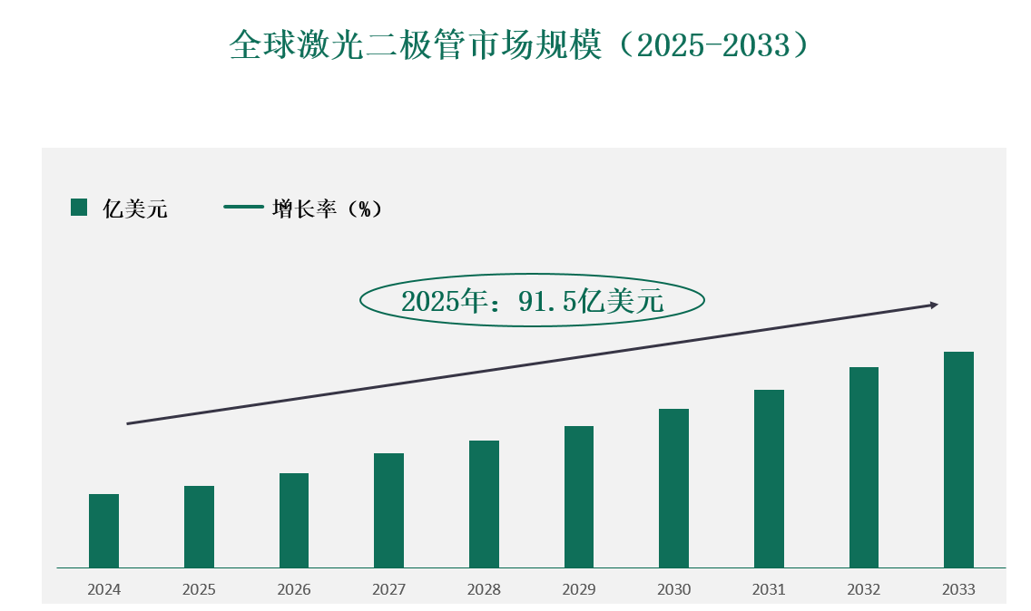 2025年全球激光二极管市场规模为91.5亿美元,预计到2033年将超过258.4亿美元。