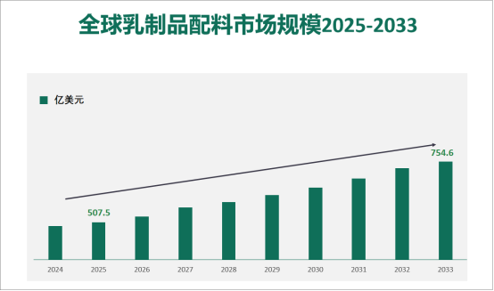 2025年全球乳制品配料2025年市场价值为507.5亿美元,预计到 2033 年将达到754.6亿美元。