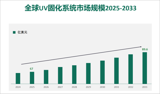 2025年全球UV固化系统2025年市场价值为67亿美元,预计到 2033 年将达到89.6亿美元。