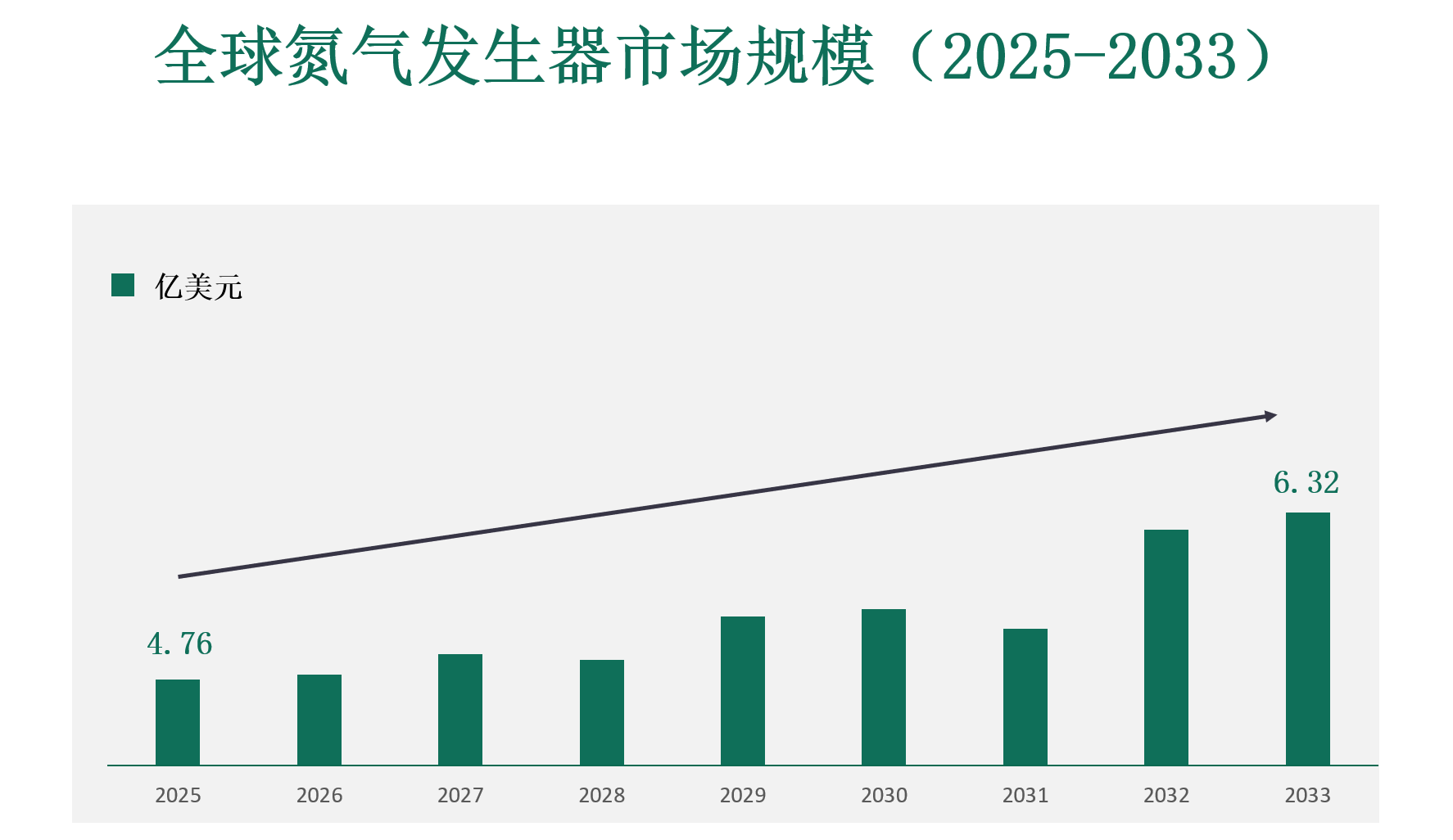2025年全球氮气发生器市场价值为4.76亿美元,到2033年将达到6.32亿美元。