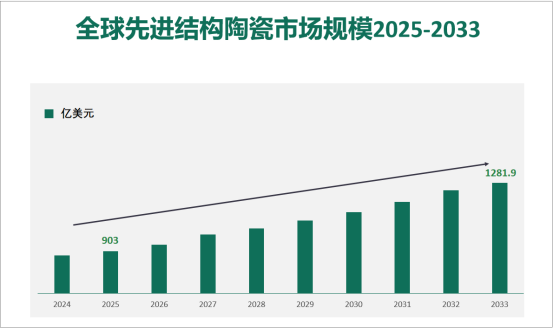 2025年全球先进结构陶瓷2025年市场价值为903亿美元,预计到 2033 年将达到1281.9亿美元。