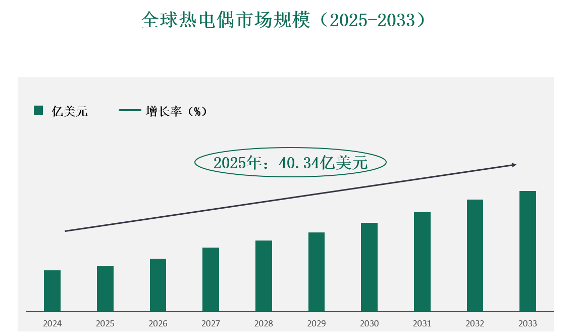 2025年热电偶市场规模估计为40.34亿美元。预计热电偶行业将到2033年的64.45亿美元。