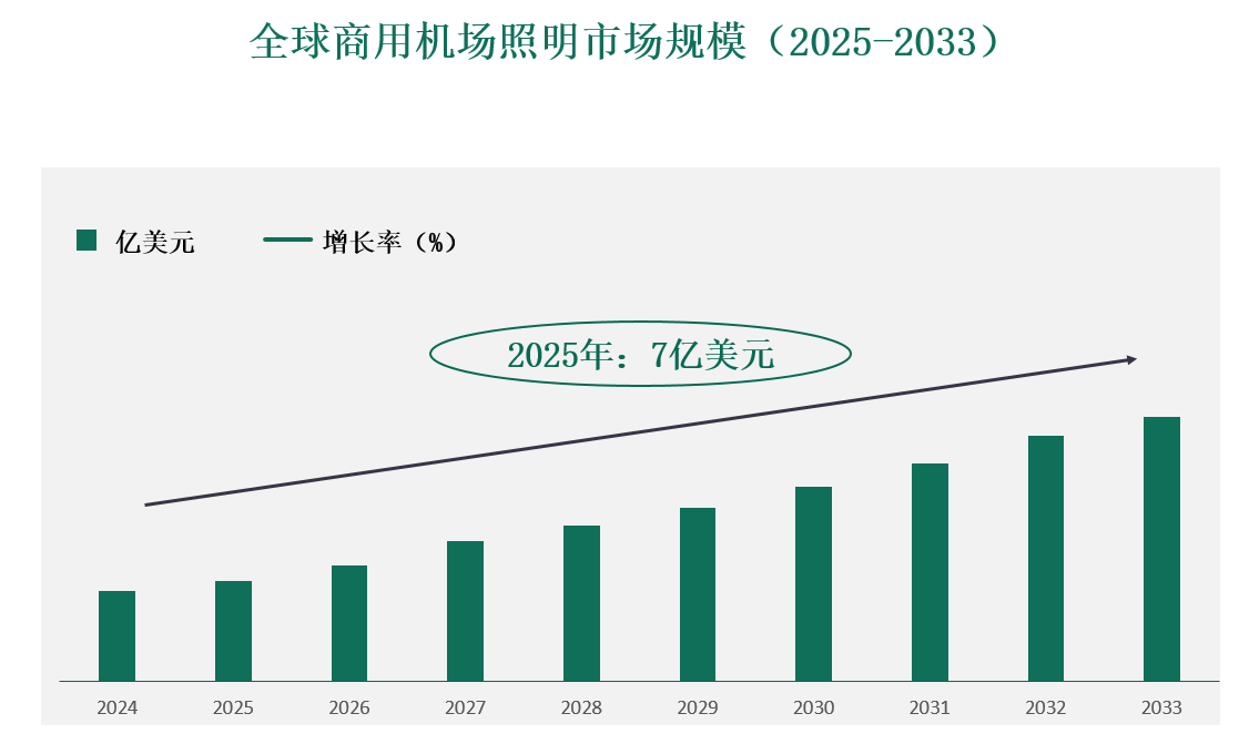 2025年全球商用机场照明市场价值为7亿美元,预计到2033年将达到13亿美元。
