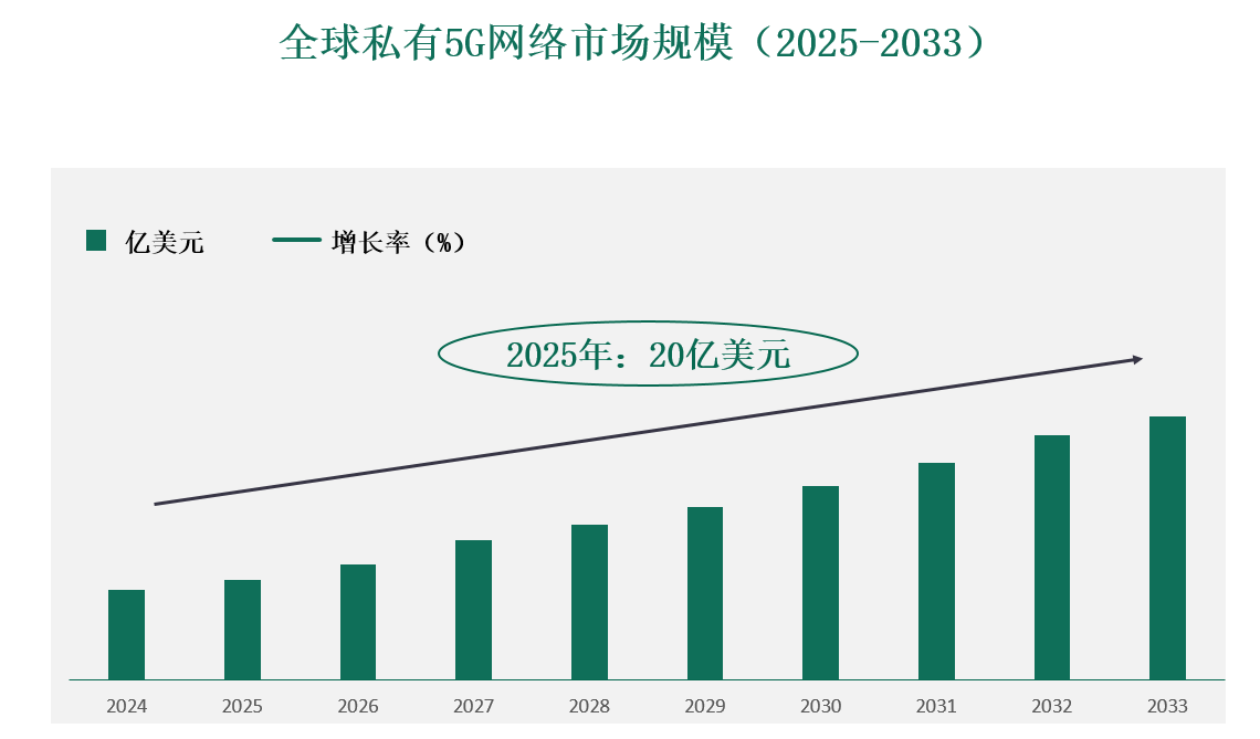 2025年全球私有5G网络市场规模估计为20亿美元,预计到2033年将达到360.8亿美元。