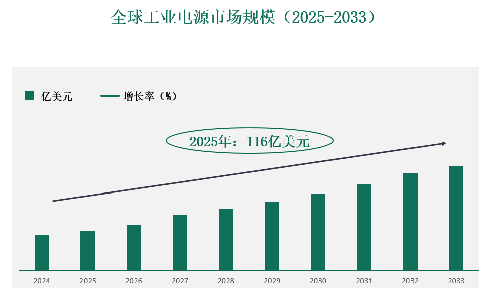 2025年工业电源市场规模为116亿美元,预计到2033年将达到321亿美元。
