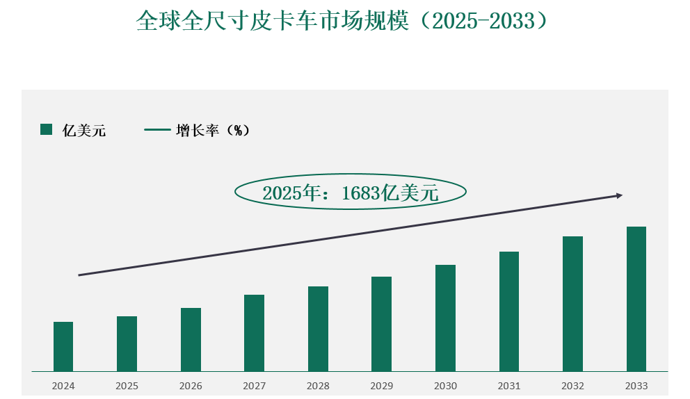 2025年全球全尺寸皮卡车市场规模达到1683亿美元,预计到2033年将增长至2369.7亿美元。