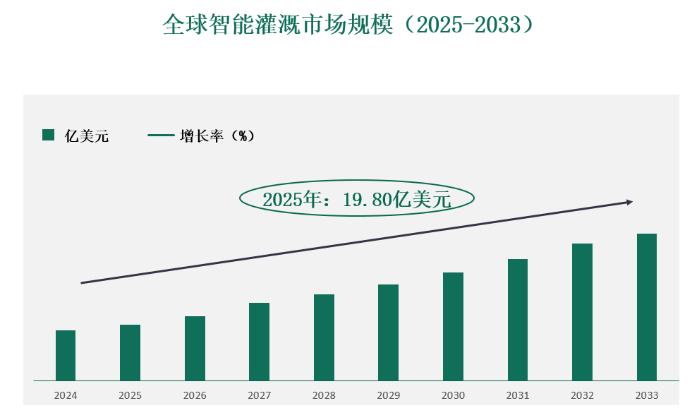 2025年全球智能灌溉市场规模估计为19.80亿美元。预计智能灌溉行业将增长到2035年的86.17亿美元。