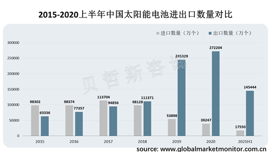 2018年以前中国太阳能电池进口数量大于出口数量,但是,随着近几年来光伏产业的迅速发展,有机太阳能电池因其成本低、重量轻、易于成批次生产、制作工艺简单和可制备成柔性器件等优点,产业规模越来越大。2018年后,中国太阳能电池不仅摆脱进口依赖,还大量出口海外,2021上半年中国太阳能电池出口数量为145444万个,进口数量为17550万个。