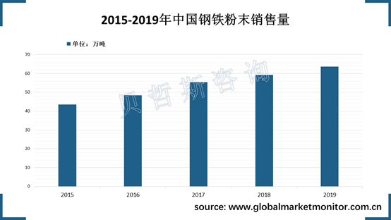 从20世纪80年代初,随着中国国民经济的快速发展,尤其是近十余年来随着中国汽车、摩托车、农机、家用电器及电动工具等行业的突飞猛进,有力地推动了中国钢铁粉末的发展。根据中国钢结构协会粉末冶金分会数据显示:2015-2019年中国钢铁粉末销售量逐年增加,2019年中国钢铁粉末销售量为63.6万吨,较2018年增加了4.07万吨,同比增长6.84%。