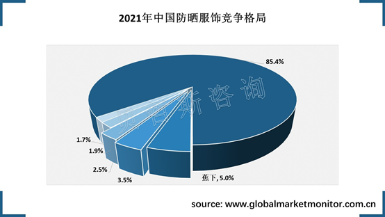 中国防晒服品牌众多,代表品牌有天堂、海螺、蕉下、ohsunny、VVC、蕉内等,其中,2021年天猫618销售表现较为突出的有蕉内和蕉下,GMV分别为1.8亿、1.44亿。行业整体集中度低,2021年top5品牌整体销售额市占率仅14.6%,其中排在首位的蕉下品牌2021年总零售额为31亿元,市占率约5%。