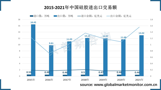 据海关数据显示,中国硅胶出口量远大于进口量,是全球主要的硅胶生产来源国,2021年中国硅胶出口总量达到13.02万吨,出口金额为1.56亿美元,但中国硅胶进口单价较高,2021年中国进口硅胶平均单价为3913.04美元/吨,出口平均单价为1198.16美元/吨,进口硅胶价格约为出口硅胶价格的三倍,中国高端硅胶市场还有待发展。