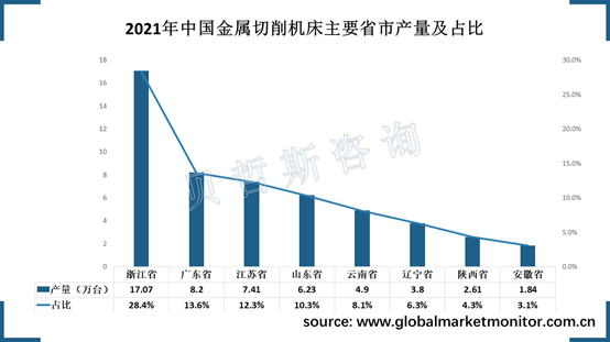 就产量省市分布情况而言,中国金属切削机床主要位于沿海发达城市,包括浙江、广东、江苏和山东等,整体区域分布相对集中。根据数据显示,2021年中国金属切削机床前五省份占比之和约占72.8%,其中浙江省占比最高,产量为17.07万吨,占比达28.4%。